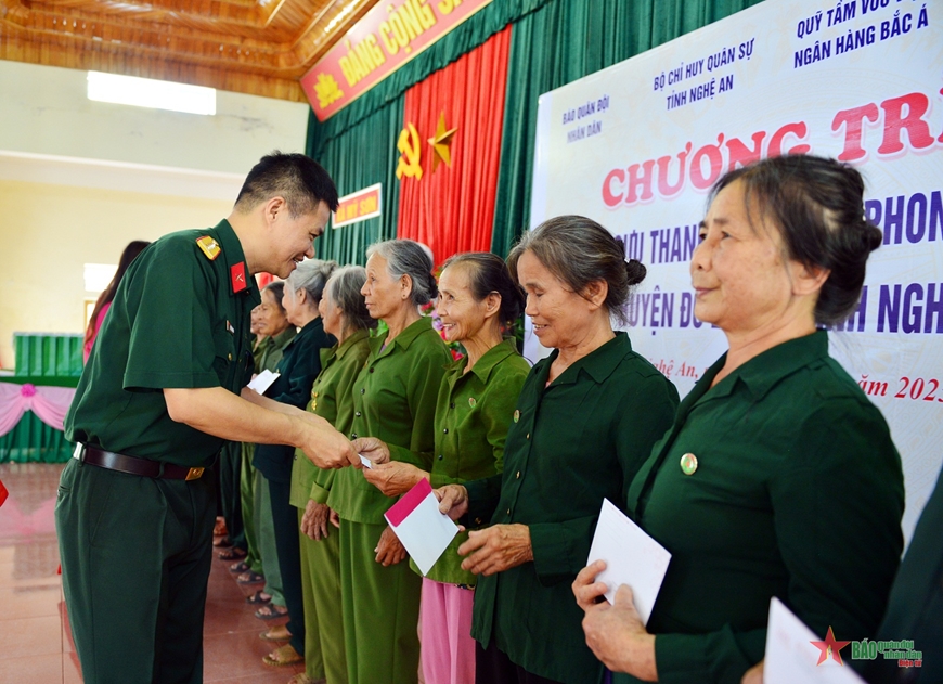 Cùng suy nghĩ đó, chị Vũ Thu Hằng bày tỏ: “Uống nước nhớ nguồn là đạo lý mà chúng cháu được giáo dục rất kỹ trong doanh nghiệp của mình. Quỹ Vì tầm vóc Việt do Tập đoàn TH thành lập là một tổ chức phi lợi nhuận với sứ mệnh đóng góp cho mục tiêu phát triển bền vững. Hằng năm, Ngân hàng TMCP Bắc Á và Tập đoàn TH thông qua Quỹ Vì tầm vóc Việt đã triển khai rất nhiều hoạt động an sinh xã hội vì cộng đồng, trong đó có các hoạt động tri ân người có công, giúp đỡ các đối tượng chính sách, người nghèo trên phạm vi cả nước. Riêng tại Nghệ An, từ đầu năm đến nay, lãnh đạo của Ngân hàng TMCP Bắc Á-Tập đoàn TH đã cam kết xây 300 ngôi nhà Đại đoàn kết tặng người nghèo. Sự kết nối của Báo Quân đội nhân dân trong việc tri ân các cựu TNXP Truông Bồn lần này là một trong những hoạt động rất ý nghĩa nhân dịp kỷ niệm 76 năm Ngày Thương binh-Liệt sĩ. Mong các bác cựu TNXP đón nhận tình cảm chân thành biết ơn của thế hệ đi sau, tạo động lực cho thế hệ trẻ như chúng cháu tiếp tục rèn luyện, phấn đấu”.